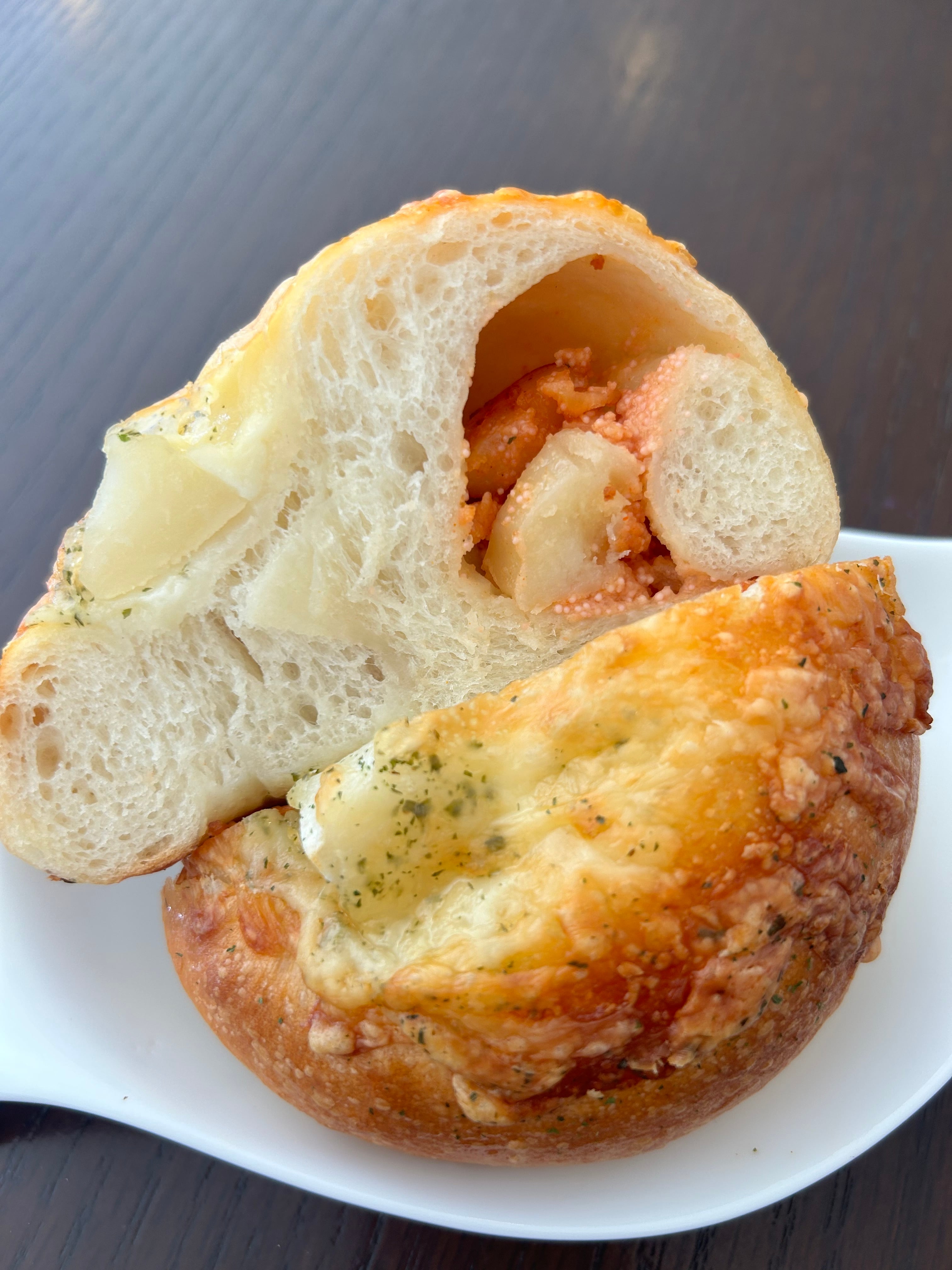 中にじゃがいもとめんたいこ、上にチーズをのせて焼き上げました